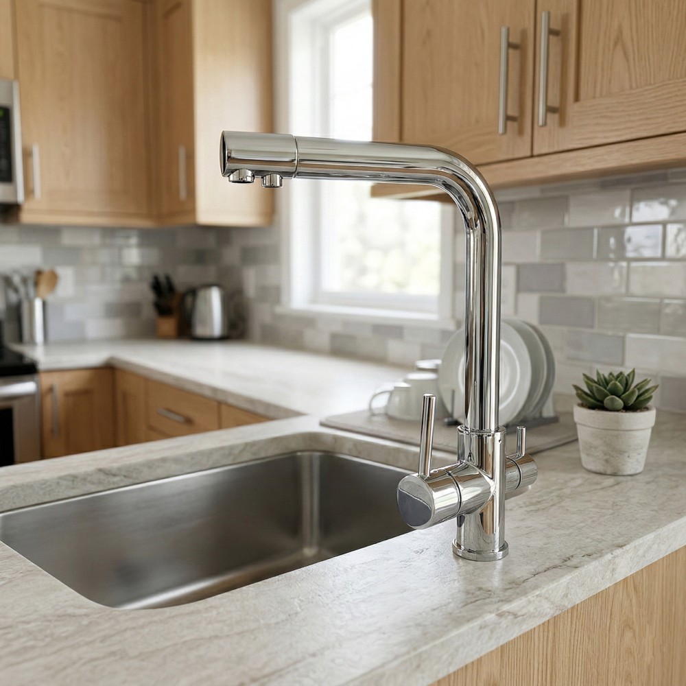 Furnizarea apei purificate se face printr-un traseu separat astfel incat sunt pastrate proprietatile apei.Bateria monocomanda pentru bucatarie cu teava lunga, este echipata cu cartus ceramic de Ø 40 mm si racorduri flexibile pentru alimentare cu apa calda si rece.